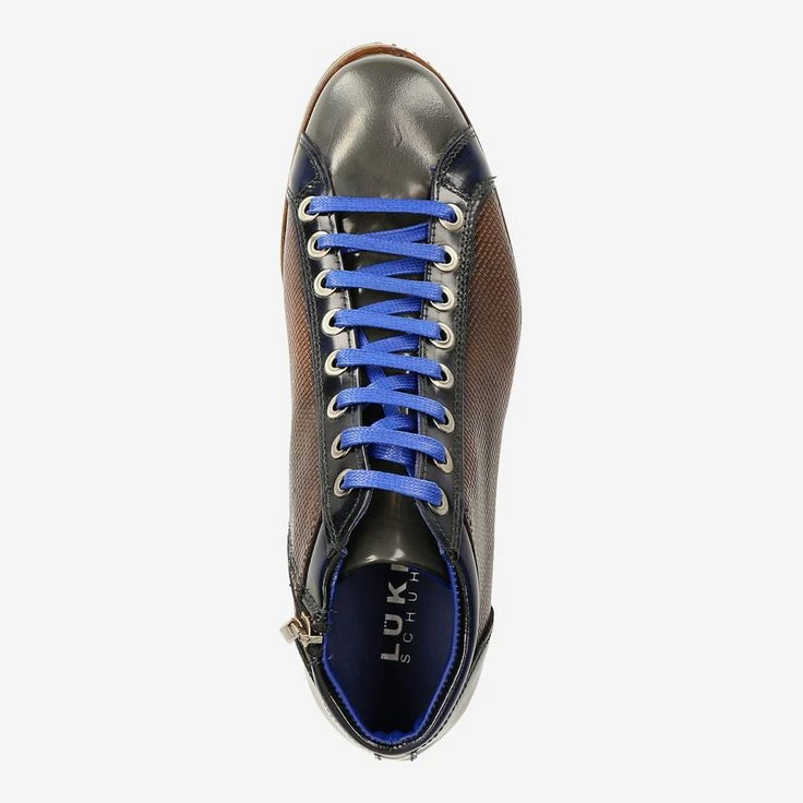 A boot that has it in itself! In these Lüke men’s boot model was used shiny smooth leather, which has experienced different processing. On the one hand, the material is found on the cap and heel in its smooth form and on the sides with a structured surface, which resembles a snakeskin. However, what directly catches the eye when looking at the model are the blue laces that powerfully contrast the shoe and attract all attention. A zipper on the inside of the foot facilitates entry and exit.