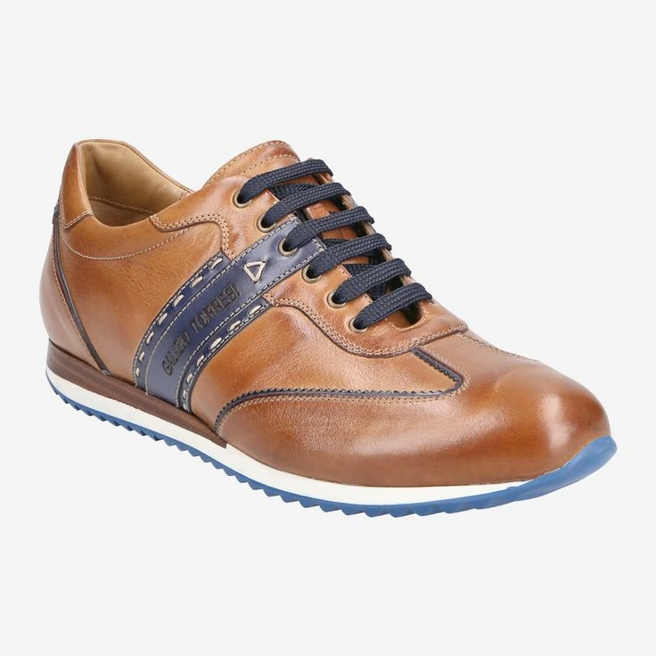 This luxury sneaker from the manufacturer Galizio Torresi combines quality, elegance and taste, while the design is as sporty as it is classy. The brown smooth leather is complemented by label embossing, as well as blue leather details exciting. The light sole loosens up the look playfully and airy. This lace-up shoe looks its exclusive quality at first sight.