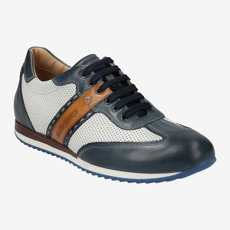 Treat yourself to this blue and white luxury sneaker from Galizio Torresi! The outstanding smooth leather is sewn in extraordinarily precise workmanship. The visual interruption by the cognac brown logo application ideally sets the sporty look in scene. Finest perforations refine the white smooth leather and create an exciting, plastic effect, Reduced single pair!