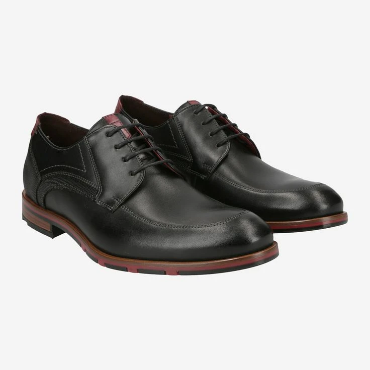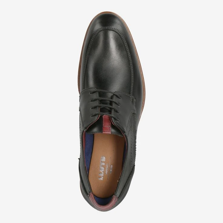 Elegance and sophistication combines this exclusive, black smooth leather derby shoe from LLOYD. The model “Denos” convinces with high comfort. The Unique Foam dampens optimally. The rubber sole is non-slip and the shoe is breathable. High-quality details such as the structurally embossed heel section of black leather and the red accents give this business shoe the finishing touch!