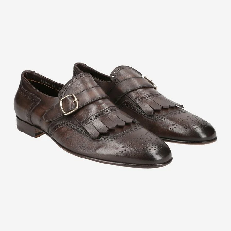 A luxurious companion for everyday business or private occasions are these loafers from Santoni made of dark brown smooth leather, which are provided with a decorative Lyra perforation and a leather application. The elegant shoes are made entirely of leather on the inside and thus offer the wearer the best comfort all around. In addition, the sturdy leather sole provides maximum tread resistance.