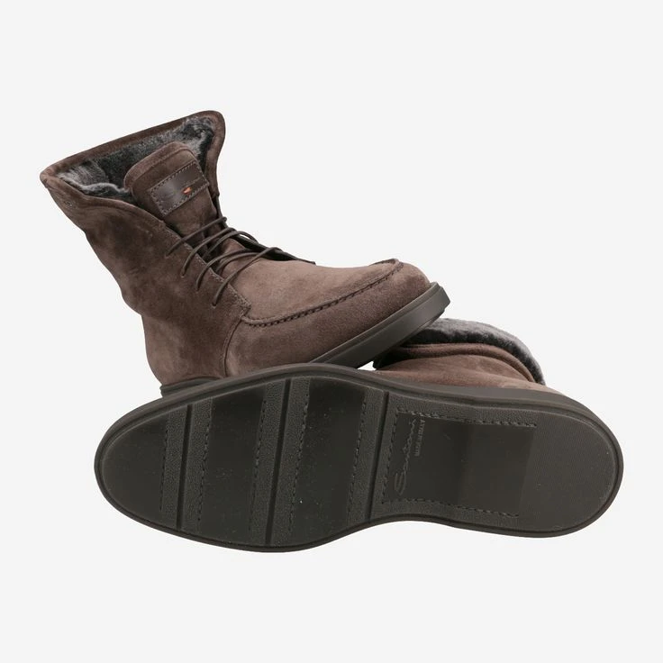 With a SANTONI you wear more than a noble shoe. You are part of the SANTONI family! It embodies values such as a sense of family, love of tradition and appreciation of handwork. Every shoe carries the Italian soul. Each one is handmade and smells of the finest leather. This winter boot is made of espresso brown suede. A thick, cozy lining of 100% sheepskin gives you warm feet. The shaft is worn folded down, but can also be put up. This allows you to tuck them under your pants or wear them over your feet on very cold days. Lifestyle and soul – an Italian dream team!